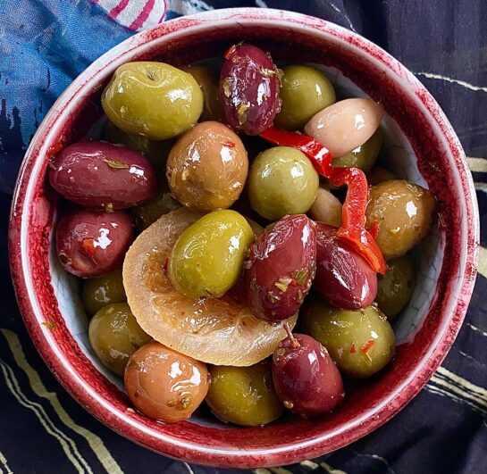 Add to a tapenade/muffaletta olive spread repertoire a zingy, lively combo united by pomegranate molasses and find yourself with a multi-purpose condiment as well as a dip in its own right.