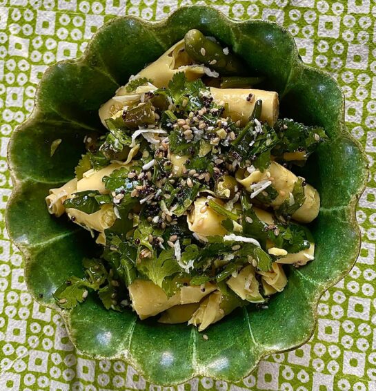 Green and vibrant and ready to toss with noodles of all sorts is an herb-dominated tonic for those with the tomato-missing blues. And anyone who thinks it’s time for a change-up.