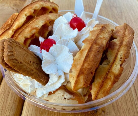 At Jersey Cow Ice Cream in Northfield, there are welcoming hand-warmers, shots of hot espresso to be poured over homemade hard ice cream and, best of all, a limited-edition sundae built on waffles made on the spot.