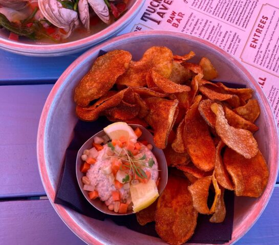 Straddling The Sandbox, a bar true to its name at Seastreak Beach, is a small food truck pod with varying vendors. Whether you’re debarking from one of the ferry service’s boats or coming off Sandy Hook, check to see if this seafooder-on-wheels is docked.