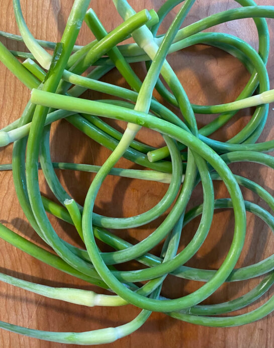 Those curlicues of green piled in bins at farmers’ markets? Grab ’em! Their uses are near-endless and their taste distinctively allium.