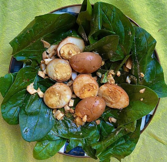 Treat the loveliest of from-the-farm spinach leaves as you would the choicest of embellished Easter bonnets and anoint the verdant petals with hard-cooked eggs soaked in a jazzed-up soy marinade.