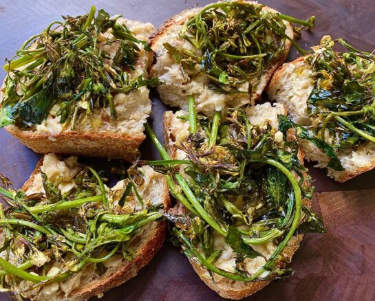 Benchmark’s country loaf, Chickadee Creek’s arugula rabe, Valley Shepherd’s smoky butter and a tin of anchovies (of all things): Can this be supper? Yes. And many other meals coming your way.