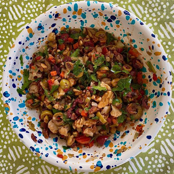 Add to a tapenade/muffaletta olive spread repertoire a zingy, lively combo united by pomegranate molasses and find yourself with a multi-purpose condiment as well as a dip in its own right.